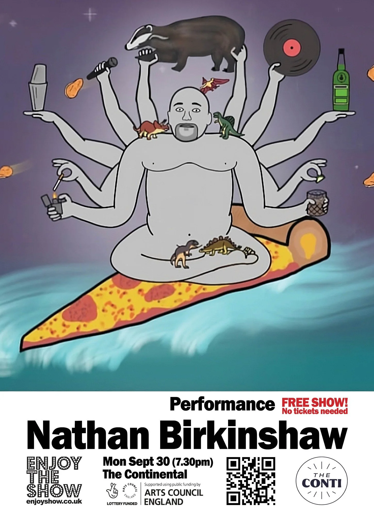 Nathan Birkinshaw is a performance artist. A performance artist and comedian, a comedian that's also a playwright. A performance artist that is also a comedian that is also a playwright and a bartender. Bartending pays the bills.